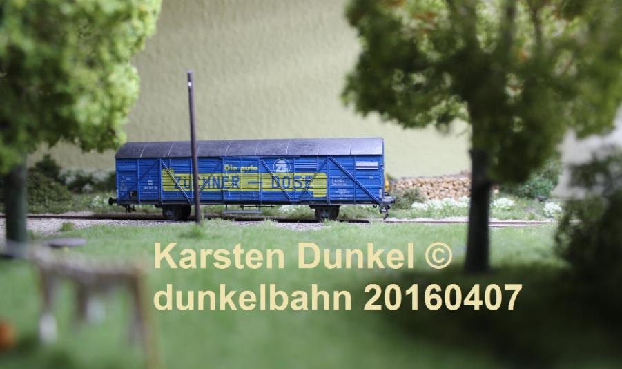 Gedeckter Wagen blau mit gelber Aufschrift "Züchner-Dose" (nach unseren Recherchen gab es 5 dieser Wagen, 2 wurden seinerzeit gleichzeitig in Barmstedt gesichtet).