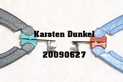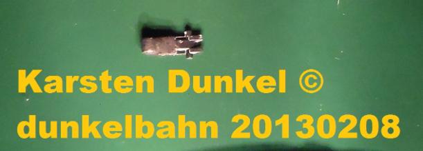 Die Kuppelköpfe sind ja das Wichtigste! Die Länge eines dunkelbahn-Magnetkuppelkopfes für die Nenngröße N beträgt 8,3 mm vom Schaftende bis zur Berührungsfläche der Magneten. Die Länge wurde so gewählt, daß die Berührungsflächen der Magnete im ungekuppelten Zustand um etwa 0,2 mm zur Fahrzeugmitte zurückgezogen gegenüber der Pufferebene positioniert sind. Im gekuppelten Betriebszustand entsteht eine mechanische Feder-Vorspannung. Der magnetische Nordpol ist in Fahrtrichtung rechts, also auf der Lokführerseite. Er kann genausogut in Fahrtrichtung links angebracht werden. Beide Möglichkeiten kuppeln aber nicht miteinander! Zum Überprüfen der richtigen Polung stellt man einen kleinen Kompaß vor die Stirnseite des Fahrzeuges.