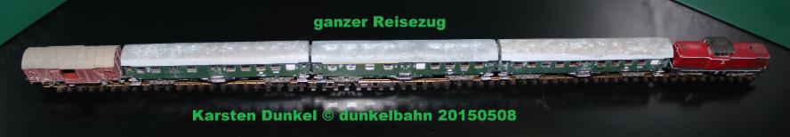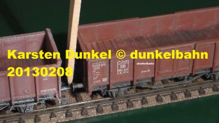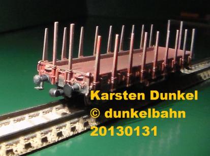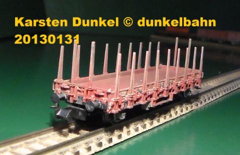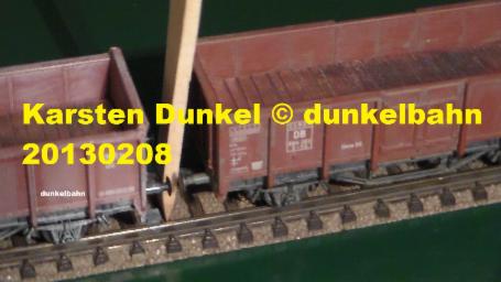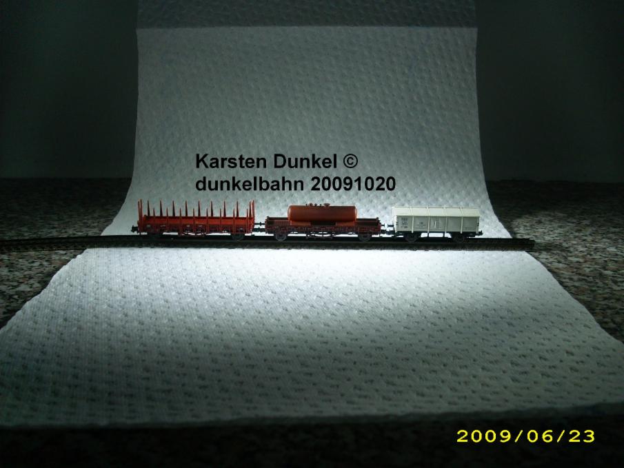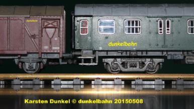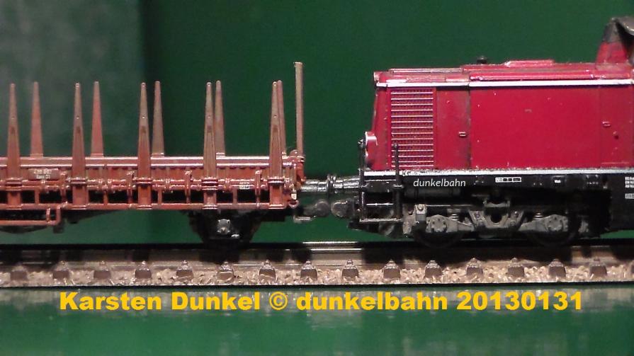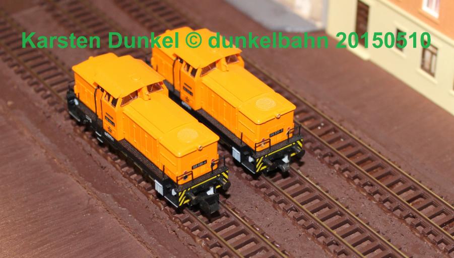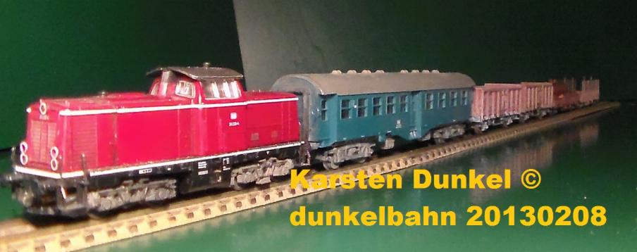 Für die Nenngröße N entstand ein Güterzug mit folgenden Besonderheiten: Alle Fahrzeuge sind gealtert / betriebsverschmutzt, ausgerüstet mit dunkelbahn-N-Magnetkupplungen, die unter Vorspannung kuppeln und brünierten RP-25-Radsätzen. Die Masse aller Wagen wurde erhöht. Angestrebt wurde dabei eine Radsatzfahrmasse von etwa 10g. Die Lok erhielt einen Dekoder MX 621 von Zimo unter Weiterverwendung des dreipoligen Original-Motors, sowie schaltbare funktionsfähige Spitzensignale.