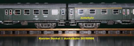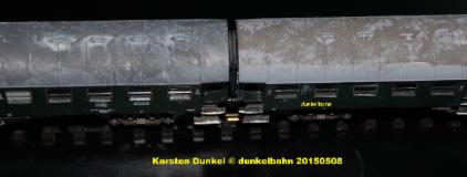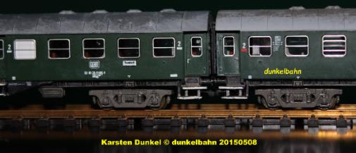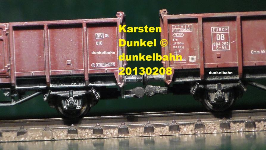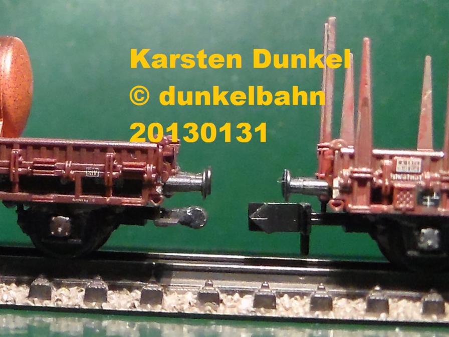 In der Seitenansicht stehen sich zwei (fast) baugleiche Wagen mit beiden Kuppelköpfen gegenüber. Deutlich ist die Kleinheit der dunkelbahn-N-Magnetkupplung zu erkennen.